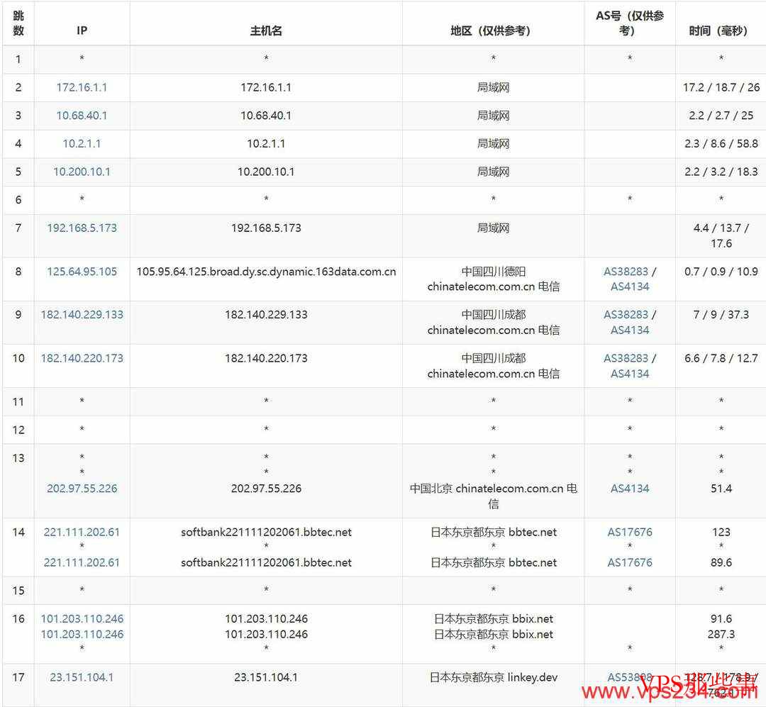 电信去程路由:从北京出口直连东京机房,使用163骨干网和软银线路,路由简洁。