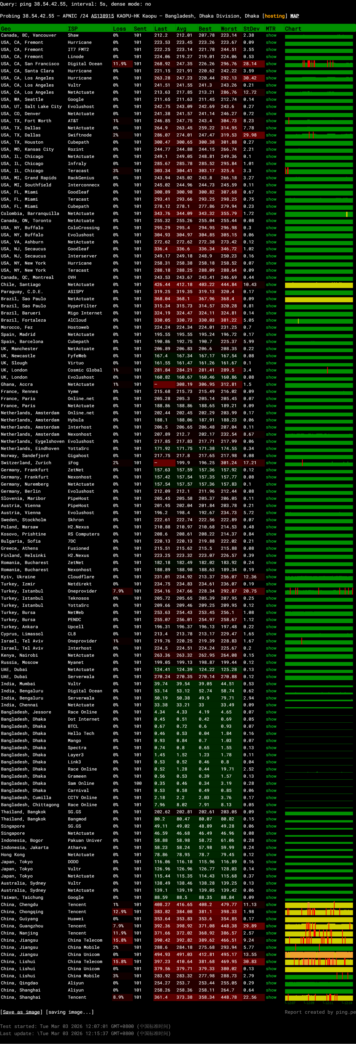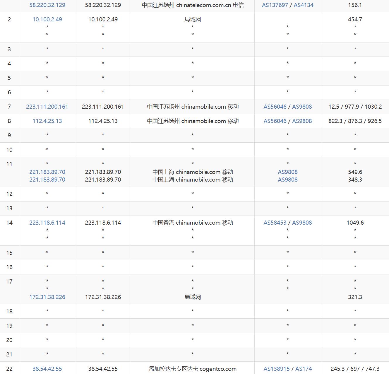 电信网络从北京出口出发,经过美国、日本、新加坡等节点,最终抵达达卡机房,走的是电信骨干网线路,这条线路的跳数较多,延迟稍高。