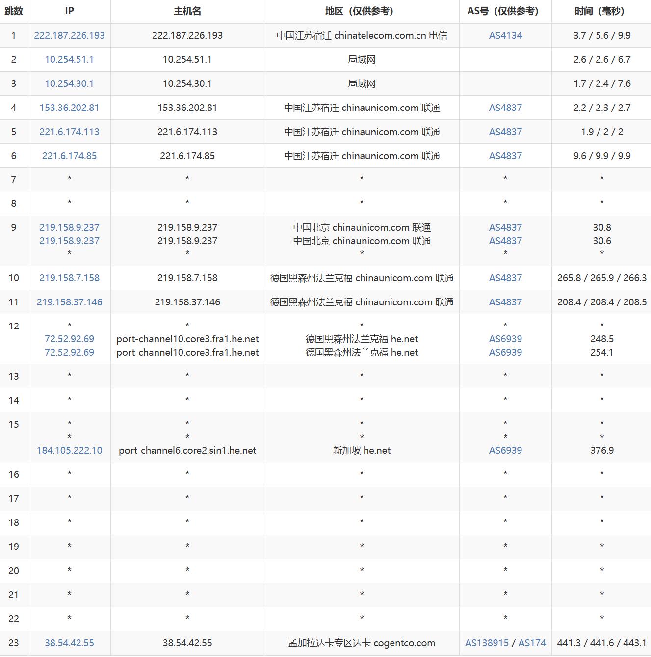 联通网络从北京出口出发,经过德国、新加坡节点后到达达卡,走的是AS4837线路,整体线路稳定性较好,但路由跳数也较多。